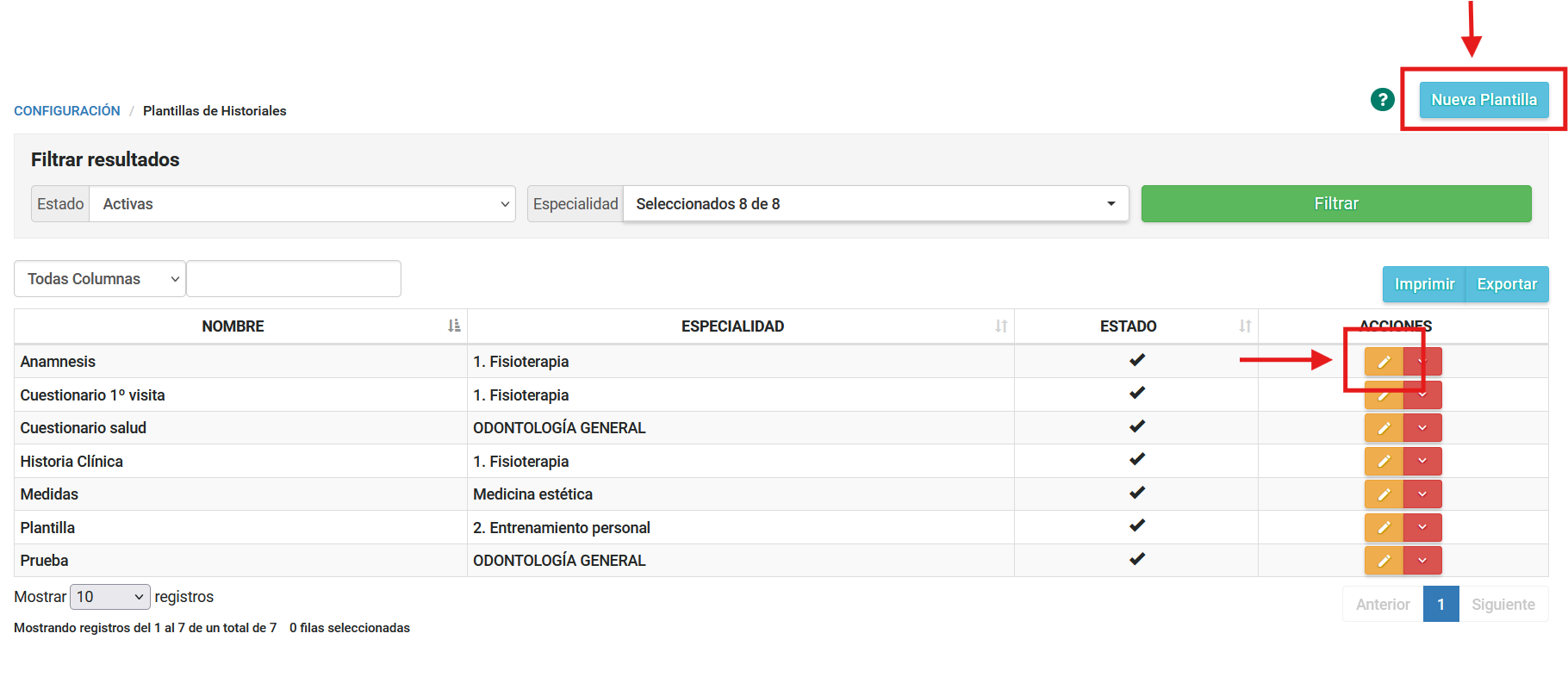 *NOTA: Las plantillas nos aparecerán en las historias clínicas creadas con la misma especialidad con la que hemos creado dicha plantilla. Es decir, si creo una plantilla con la especialidad de fisioterapia, esta únicamente aparecerá en las historias clínicas creadas con la especialidad de fisioterapia.