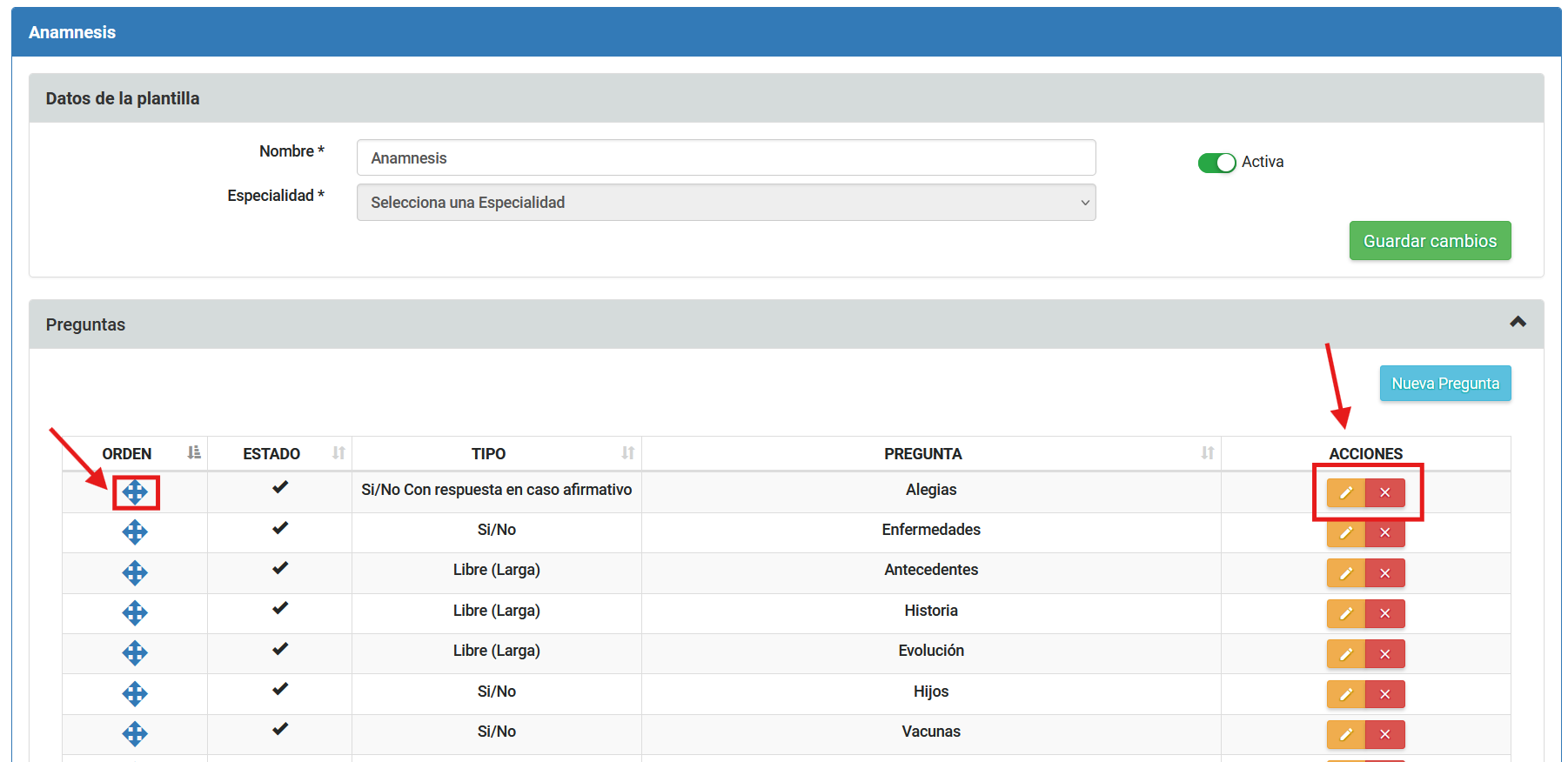 Si accedemos en alguna de ellas clicando en el lápiz de la derecha, se abrirá la ventana dedicada a editar la Plantilla: editar sus datos y definir sus Preguntas. Para reordenar clique sobre el icono de ORDEN y arrastre a la posición deseada.