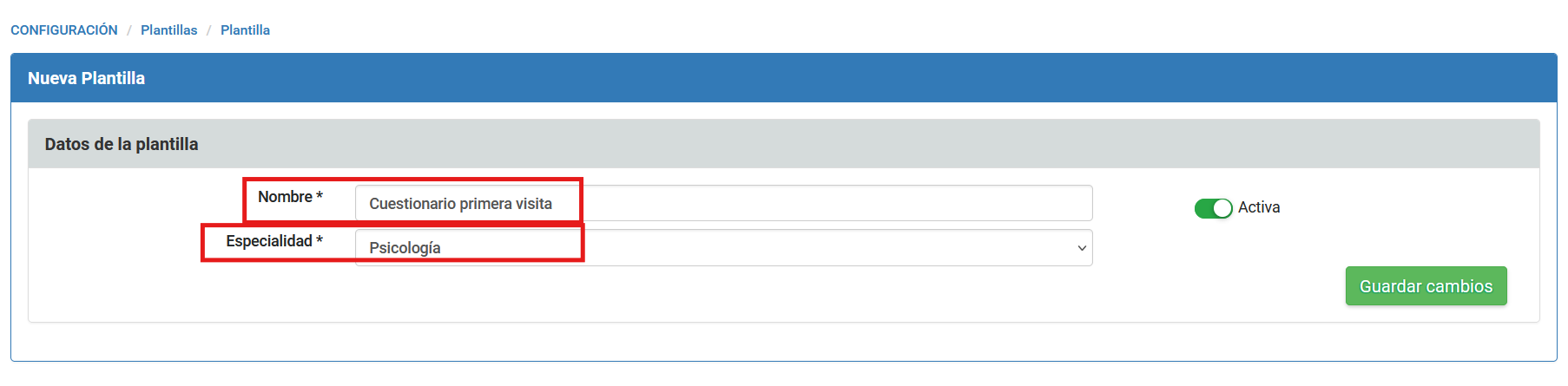 Si clicamos en Nueva Plantilla, para crear una plantilla nueva, debemos de indicar el nombre de esta nueva plantilla y su especialidad: