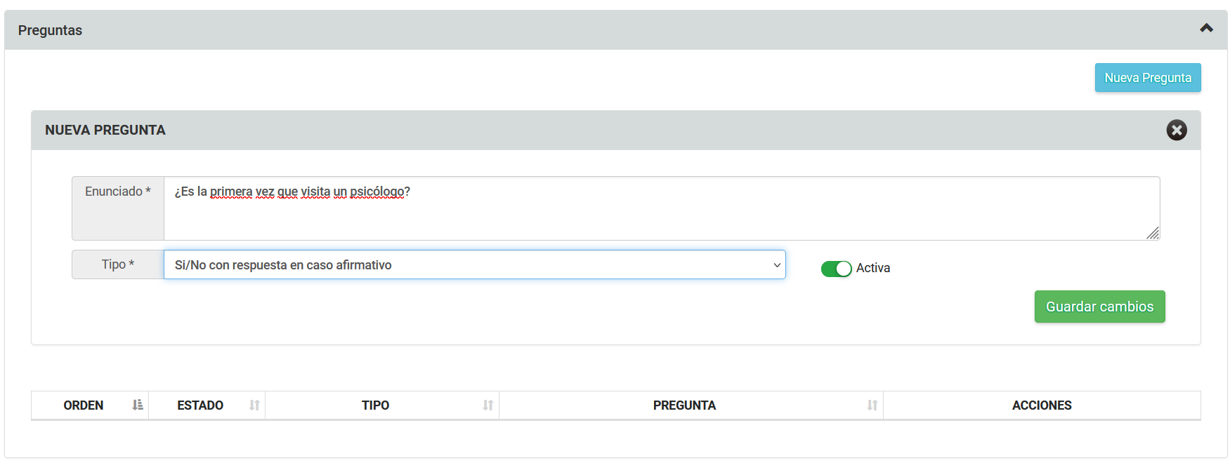 Ya podemos añadir Preguntas a nuestra Plantilla, simplemente rellenamos el Enunciado, seleccionamos el Tipo de Respuesta y pinchamos en Guardar:
