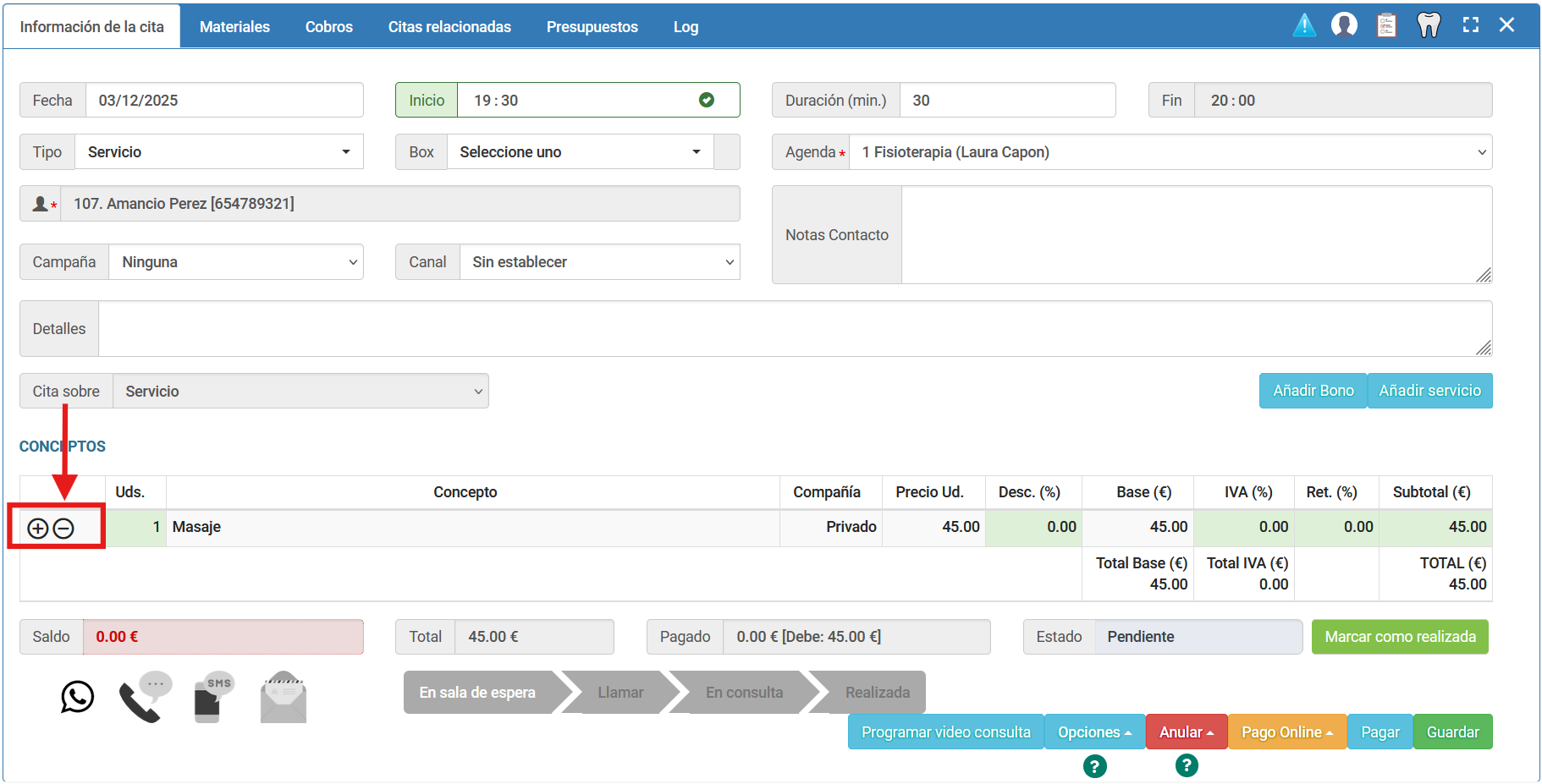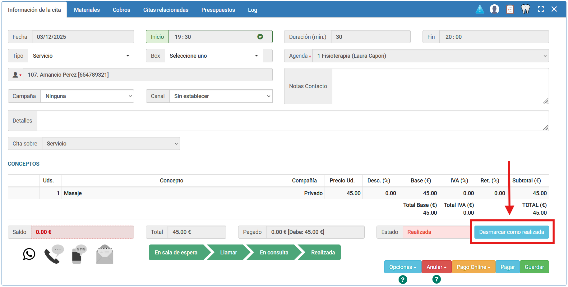 2) Marcamos la cita del servicio (NO de BONO) como No Realizada, para a continuación eliminar el servicio y añadirlo de nuevo esta vez ya establecido como BONO: