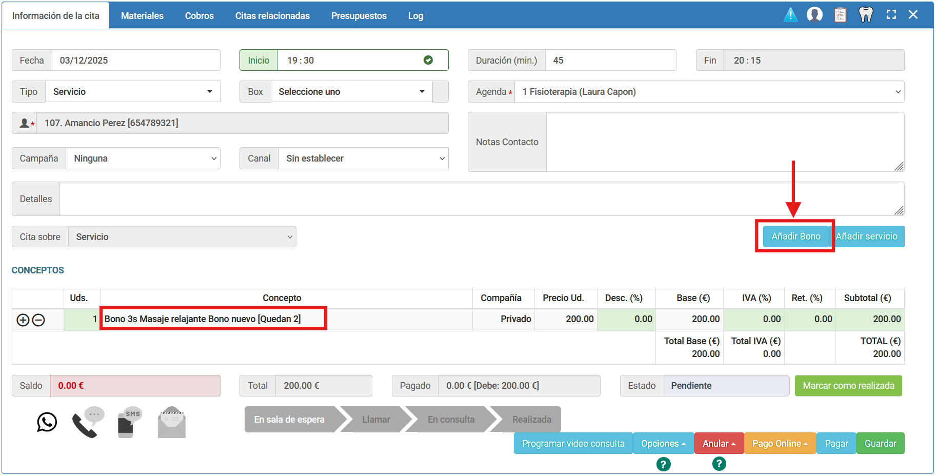 De este modo, ya quedará nuestro servicio configurado como BONO y la primera cita que dimos con el servicio que NO era de BONO, pasará a computarse como una sesión más del mismo.