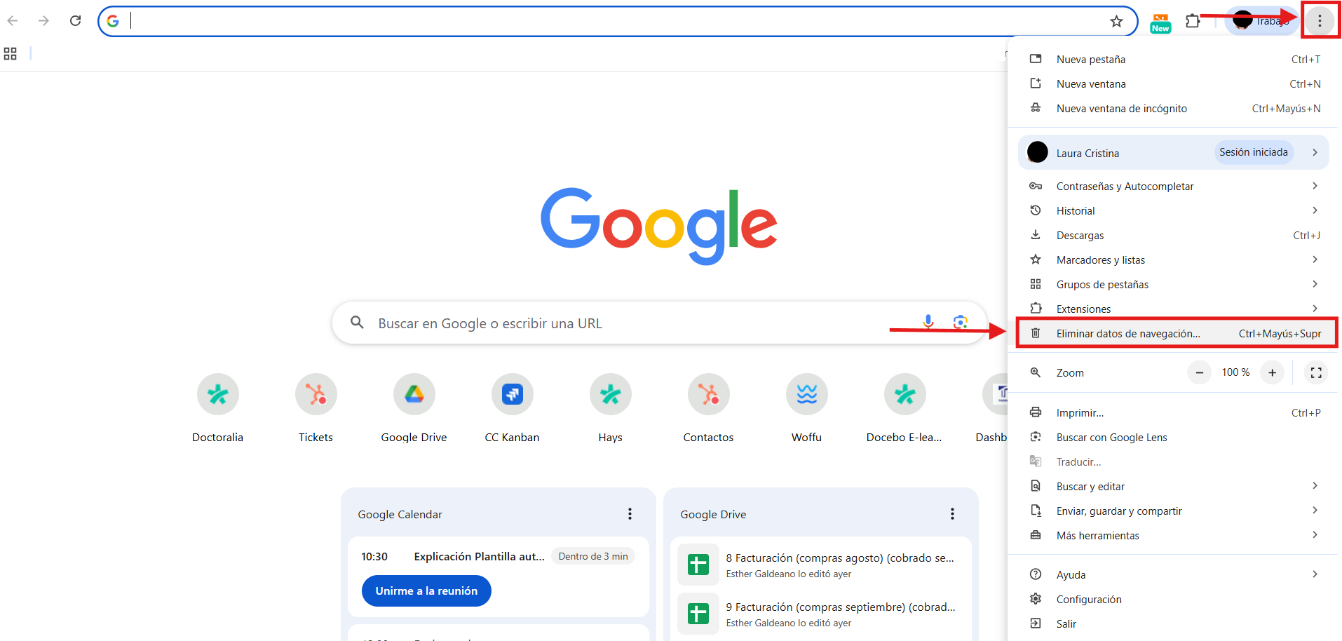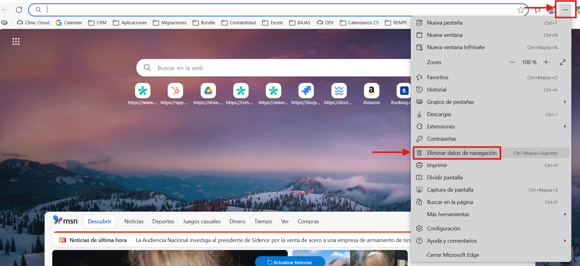Clicamos en los tres puntos que nos aparecen en la parte superior derecha del navegador y en Eliminar datos de navegación: