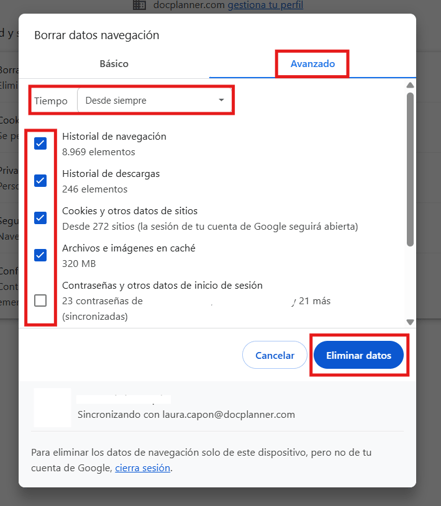 Se nos abrirá una pantalla en la que debemos marcar Avanzado, Tiempo: Desde siempre y marcar todas las opciones (excepto contraseñas):