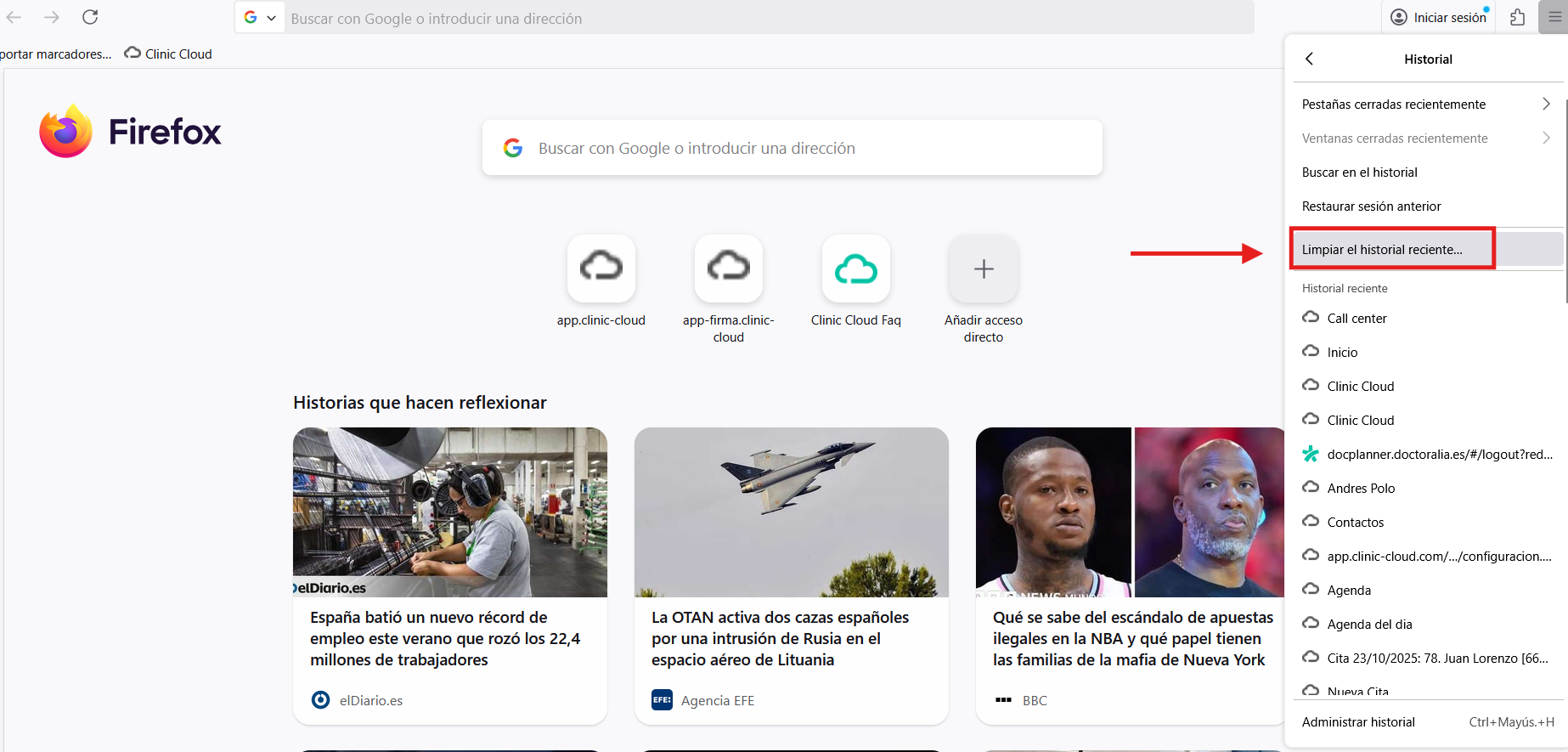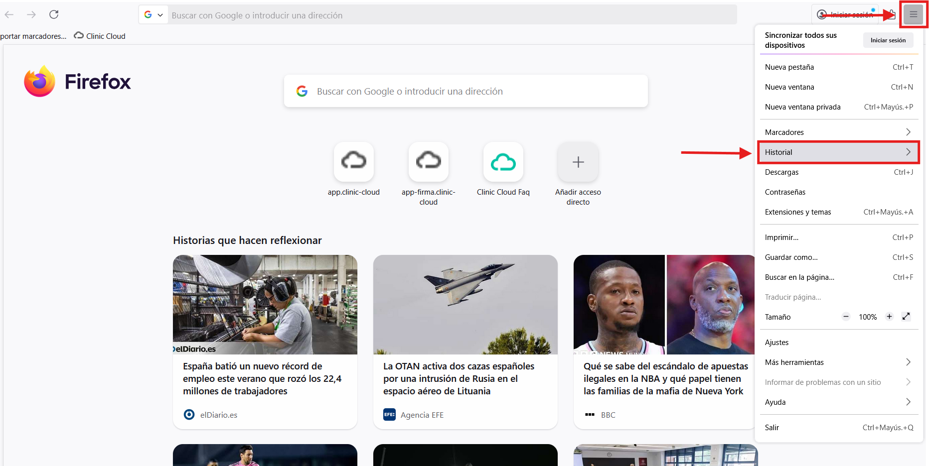 Clicamos en las tres rayas que nos aparecen en la parte superior derecha del navegador Historial: