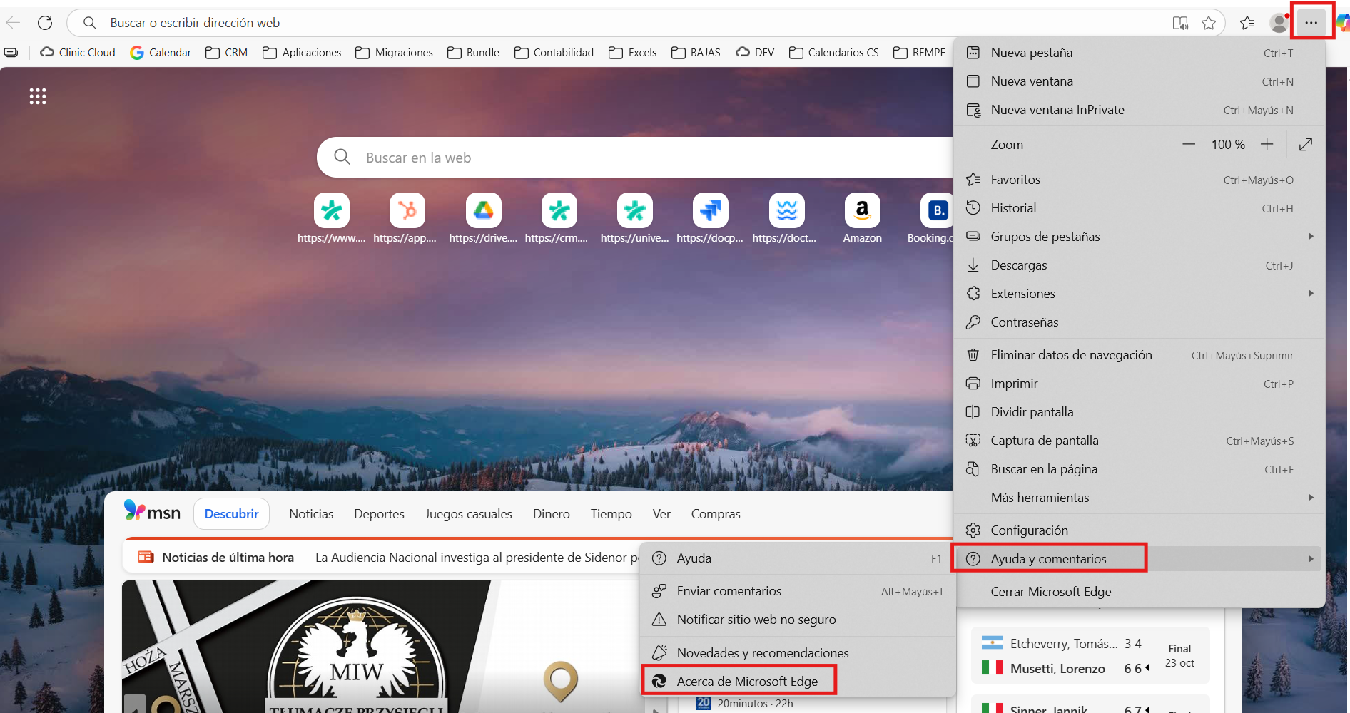 Para actualizar el navegador accedemos de nuevo a los tres puntos de la parte superior derecha del navegador, clicamos en Ayuda y comentarios y en Acerca de Microsoft Edge: