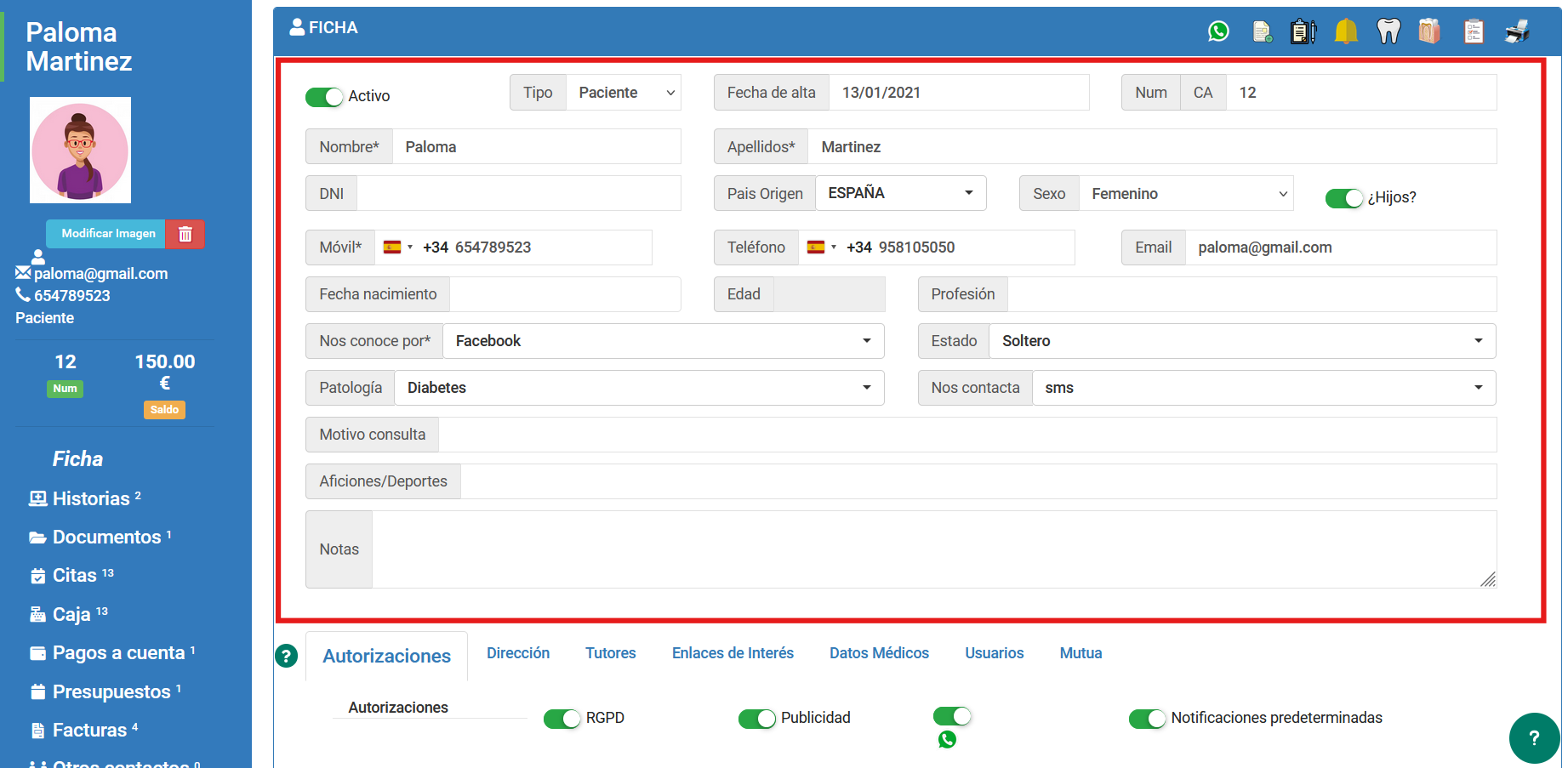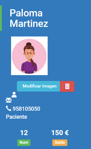 En el menú lateral se puede cargar la foto del contacto y se visualizan los datos más importantes de éste como son: nombre completo, email, teléfono, número de historia y saldo: