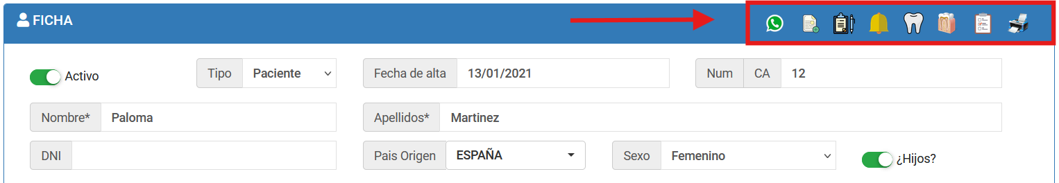 - La primera parte está compuesta de varios iconos que nos permiten llevar a cabo acciones o nos redirigen a otras partes de la aplicación, estos se encuentran en la parte superior derecha de la ficha y son los siguientes: