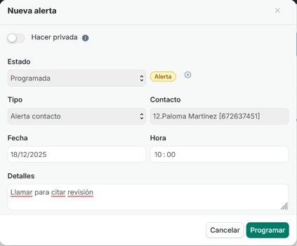 - Crear una alarma: desde aquí podemos configurar una nueva alarma para dicho contacto: