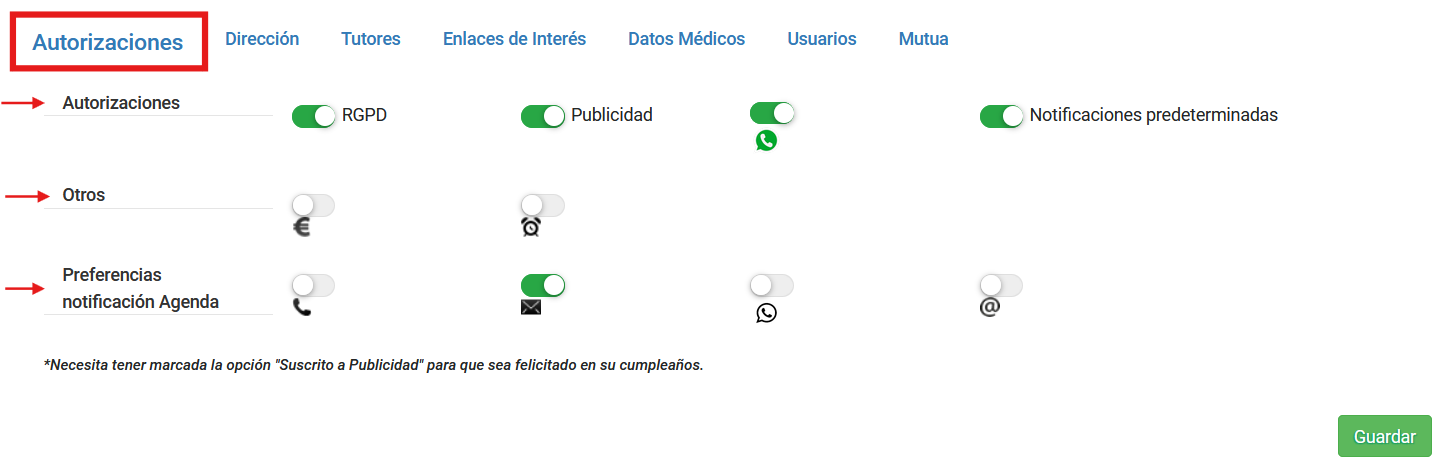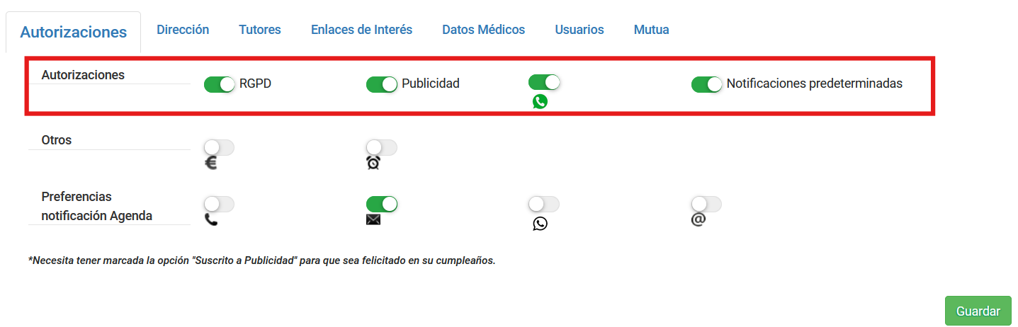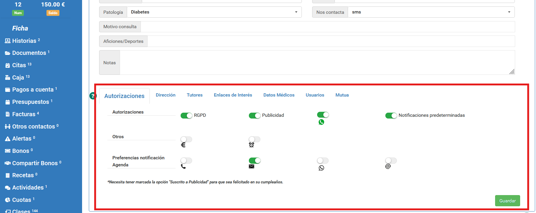 - 3.1 Autorizaciones: Esta pestaña se muestra por defecto al acceder a la ficha del contacto y se subdivide en tres secciones: