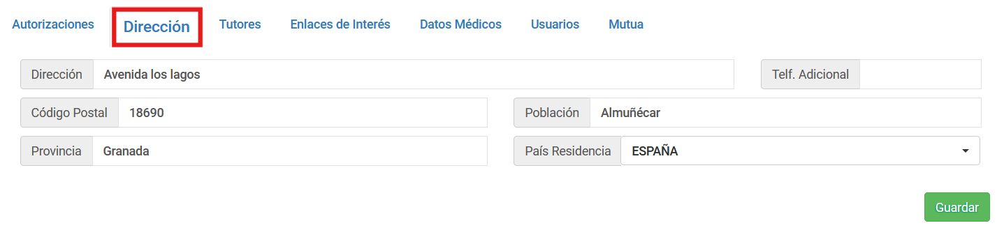 - 3.3 Tutores: en este apartado podremos poner los datos de la madre, padre o tutores legales del contacto si se trata de un menor de edad. Podremos poner tantos tutores como queramos clicando en «Nuevo Tutor», además si marcamos a uno de ellos como «Tutor Legal» este será el que se use en documentos legales (como las facturas), solo se podrá marcar a uno de ellos como tutor legal:
