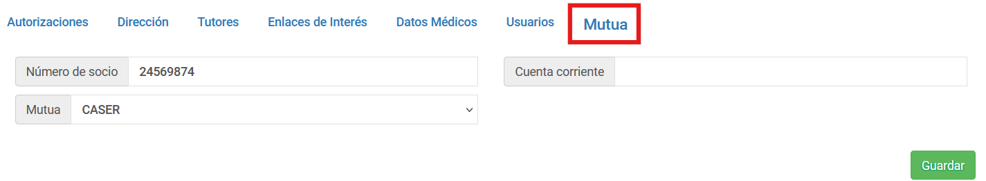 - 3.7 Mutua: en este apartado podemos establecer la mutua asociada al contacto e indicar su número de socio y su número de cuenta: