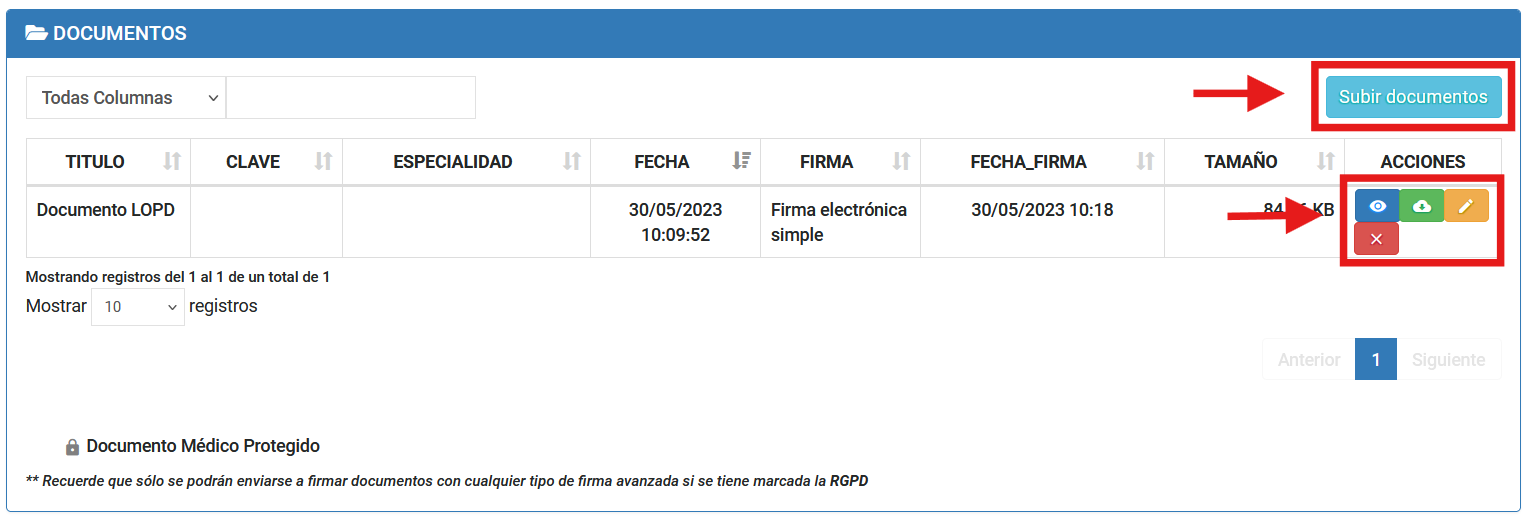 En este apartado veremos todos los documentos que tenemos guardados de este contacto y además podremos subir y guardar uno nuevo. En la parte derecha del documento tenemos las acciones de previsualizar, descargar, editar y eliminar el documento: