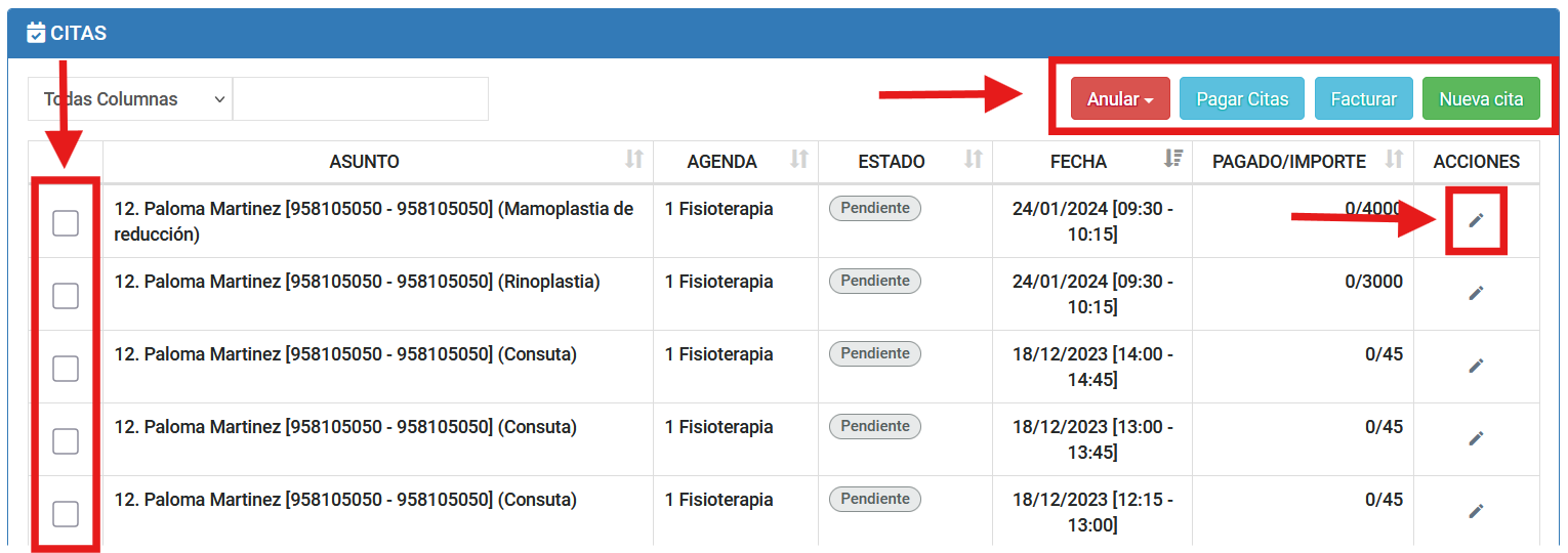 - Pagar citas: podemos seleccionar una o varias citas que no están pagadas para abonarlas