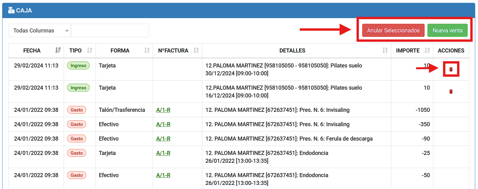 - Anular seleccionados: podremos seleccionar varios pagos y eliminarlos todos a la vez (pagos que no tengan facturas o recibos asociados).