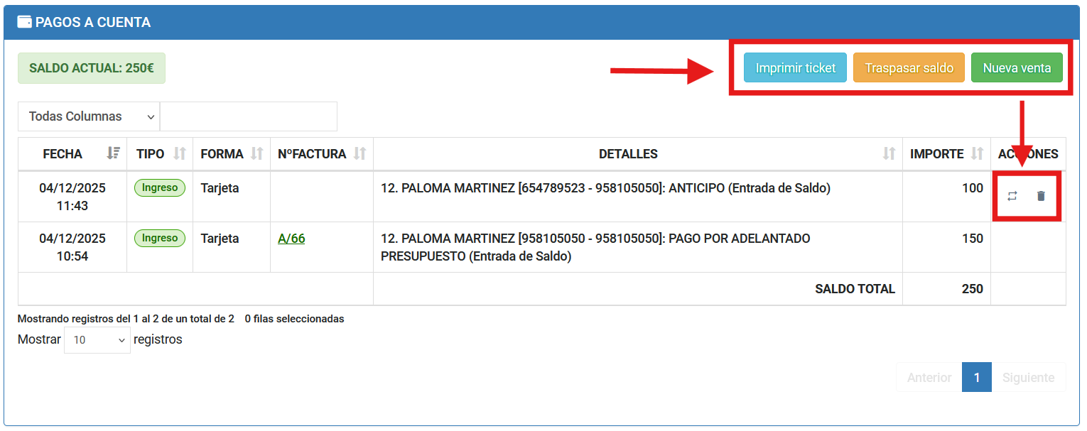 A la derecha, en la parte de Acciones, tenemos dos botones: uno que nos permite eliminar el pago a cuenta y otro con dos flechas que nos permite devolver el pago a cuenta (hacer una devolución al contacto). Si el pago a cuenta ya se ha utilizado para abonar algún servicio, este no se podrá devolver, y si además tiene factura tampoco se podrá eliminar.