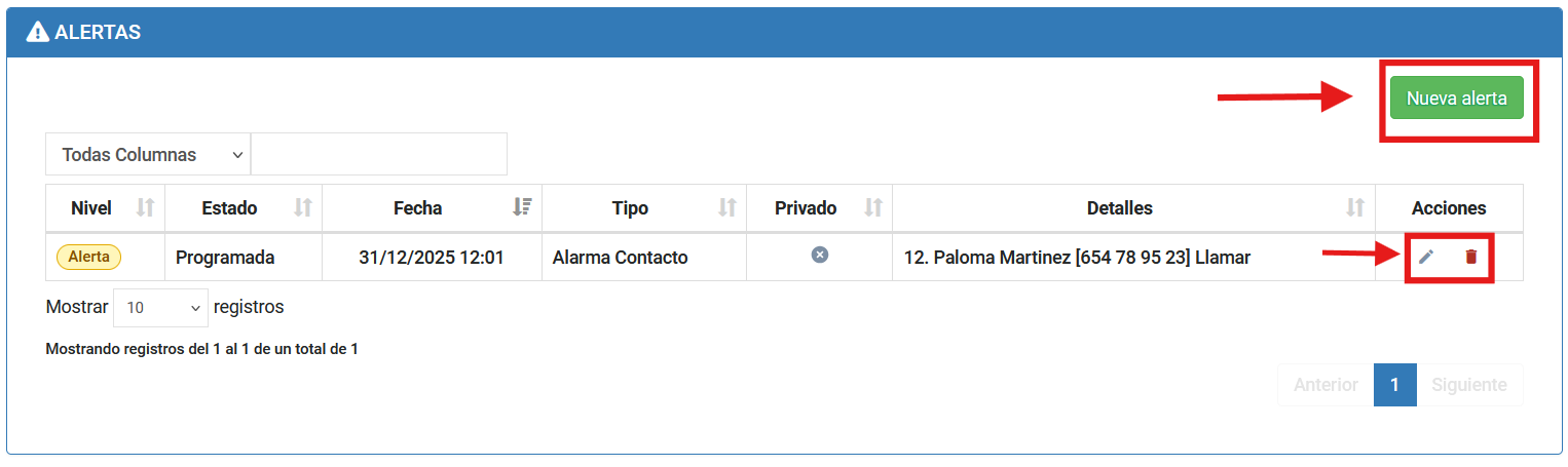 A la derecha de cada alarma, en Acciones, tenemos dos botones, el «lápiz» para editar dicha alarma y la «papelera» para eliminarla. Y podremos configurar una nueva alarma clicando en el botón Nuevo Aviso situado arriba a la derecha: