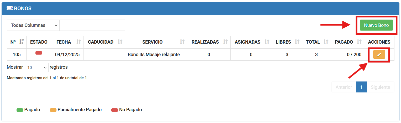 En este apartado veremos un listado con todos los bonos que tiene contratados nuestro contacto. En este listado veremos el Nº del bono, el estado del bono (verde si está pagado, naranja si está parcialmente pagado y rojo si no está pagado), la fecha en la que se le asignó el bono a nuestro contacto, si le hemos establecido una caducidad, el servicio, las citas del bono que están ya realizadas, las citas del bono que están asignadas (son citas que están programadas en la agenda pero que aun no se han realizado), las citas del bono que aún están libres (es decir, las citas del bono que le quedan por consumir), el total de citas que incluye el bono y por último el importe pagado sobre el importe total del bono. Además podremos entrar en la ficha del bono clicando en el lápiz de la derecha, o asignarle al cliente un nuevo bono clicando en Nuevo Bono: