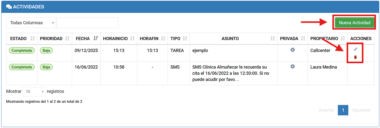 A la derecha de cada actividad, en Acciones, tenemos dos iconos: el «lápiz» que nos permite editar dicha actividad y la «papelera» para eliminarla.