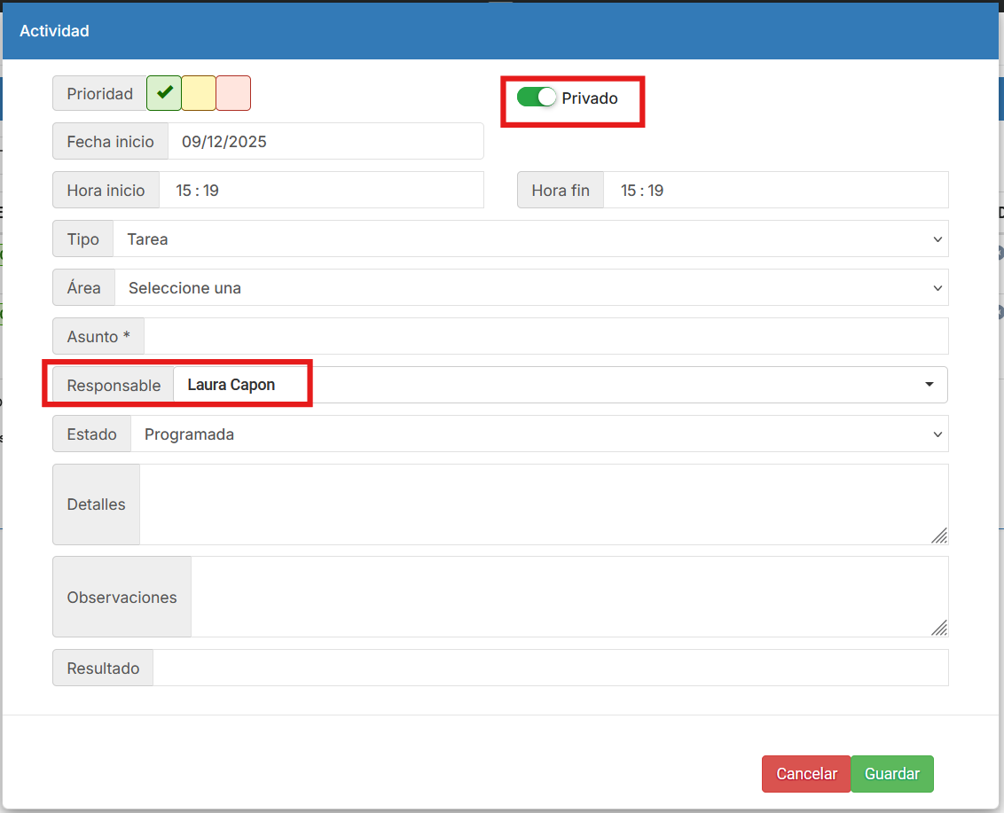 Debemos de rellenar los datos de nuestra nueva actividad y guardar para crearla. Si clicamos en el check de «Privado» esta actividad solo será visible para el usuario que sea el propietario de dicha actividad.