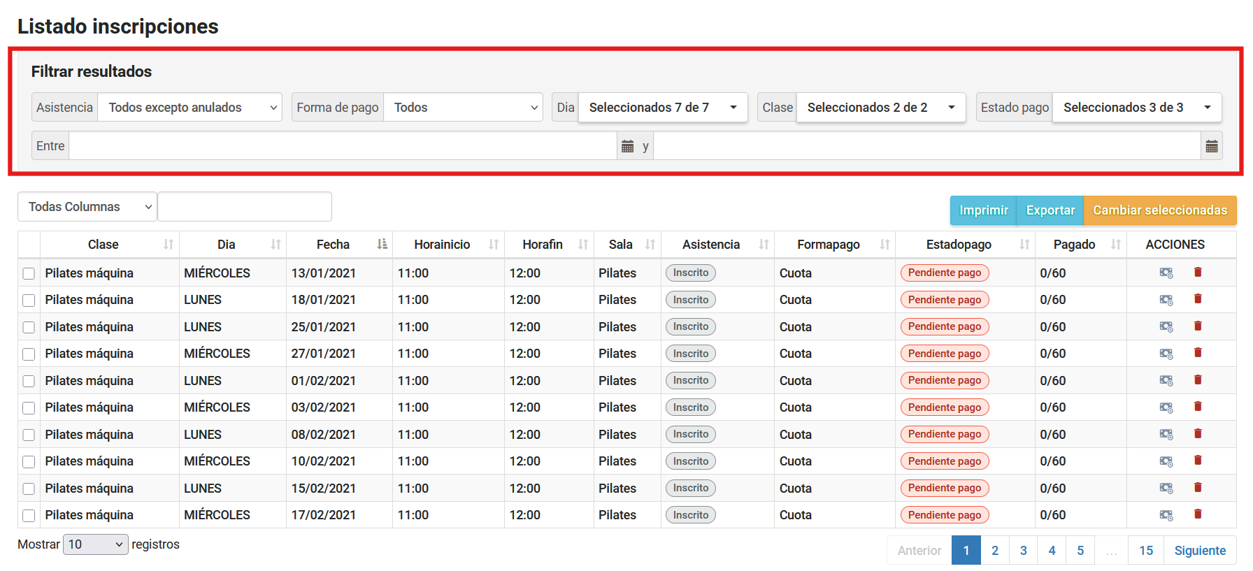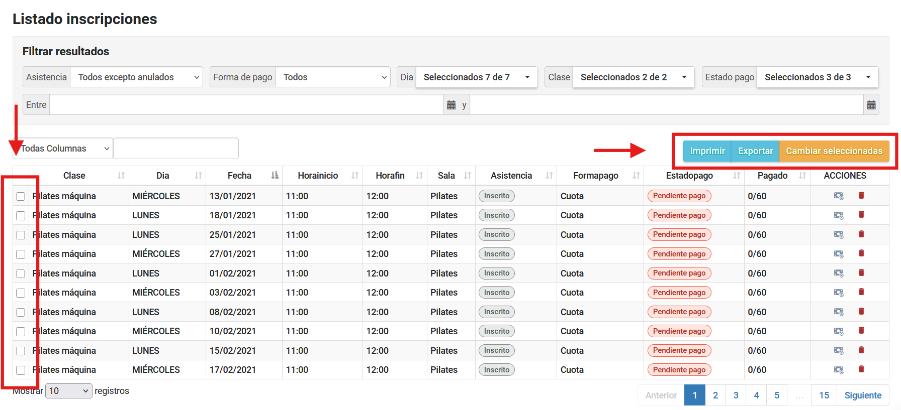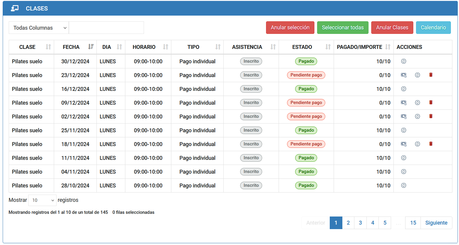 - Anular clases: anular las clases seleccionadas, siempre y cuando dichas clases no estén pagadas.