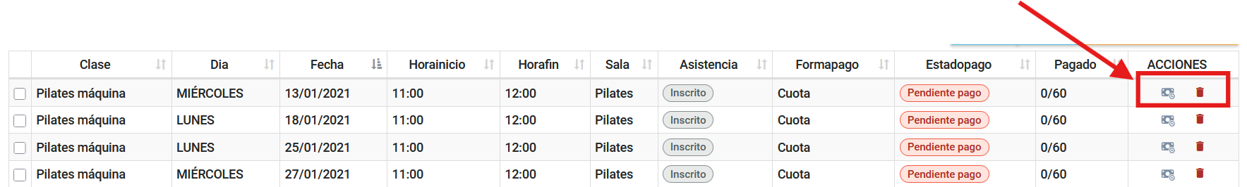 A la derecha de cada clase tenemos la «papelera» para poder eliminarla (es decir, desinscribir al contacto) y un icono de un billete para abonar la clase:
