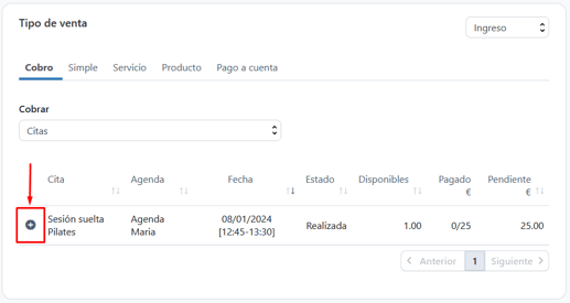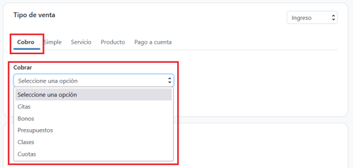 2. Una vez marques el tipo de cobro o venta, podrás seleccionar el concepto/s que deseas cobrar. En la siguiente imagen, te mostramos un ejemplo de cobro de citas.
