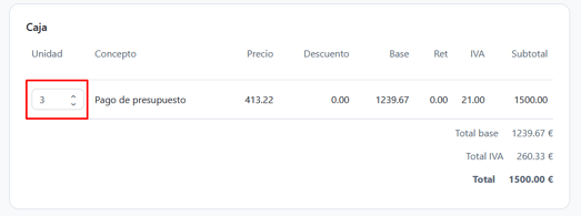 Al clickar añadir, el presupuesto se añade a la caja y el único dato que podemos editar son las unidades: