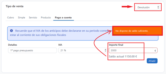 Si queremos hacer una devolución de pago a cuenta, el importe de la devolución no puede superar el saldo de nuestro cliente.