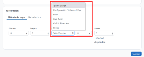 2. En Método de pago reparte el importe entre: Efectivo, tarjeta, saldo del paciente y otras formas (cómo las que te mostramos en la imagen):