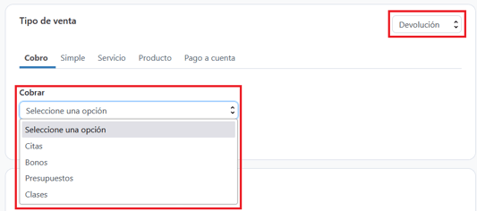Si seleccionamos la opción Devolución, no aparecerá en el selector la opción Cuotas: