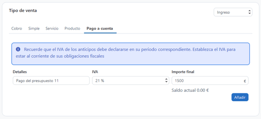 Los pagos a cuenta son incompatibles con el resto de apuntes y no podremos añadir ningún otro tipo de cobro como podrían ser citas, servicios o productos.