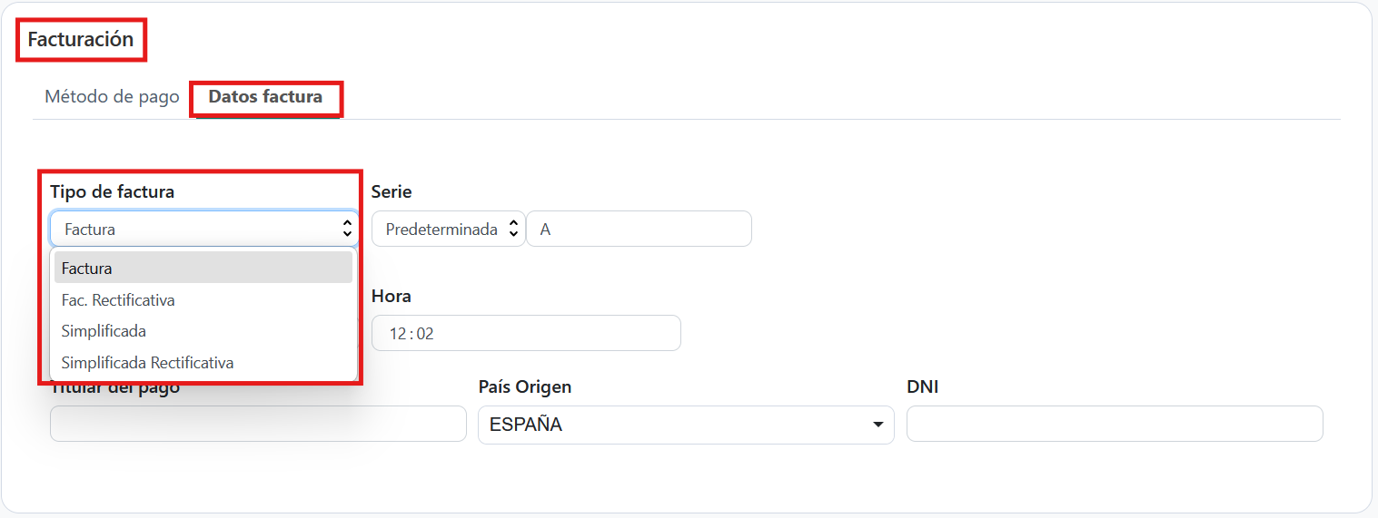 - Tipo de factura: en este apartado por defecto aparecerá Factura, ya que la facturación siempre será obligatoria.