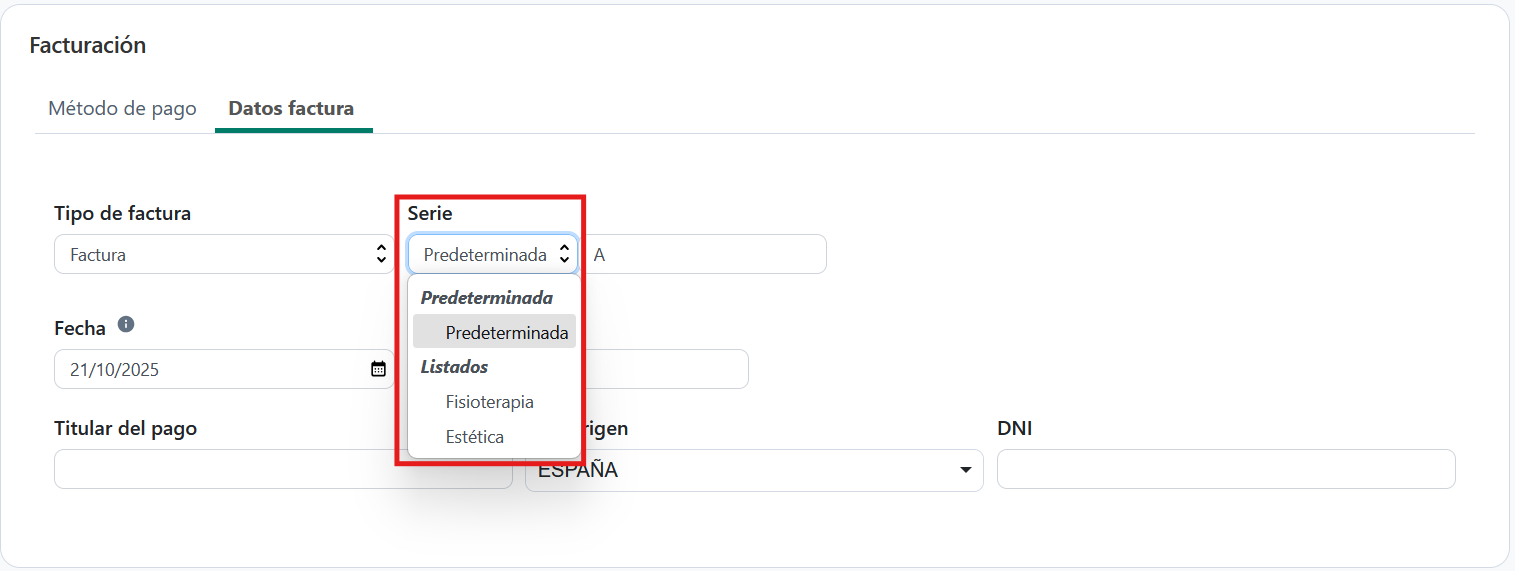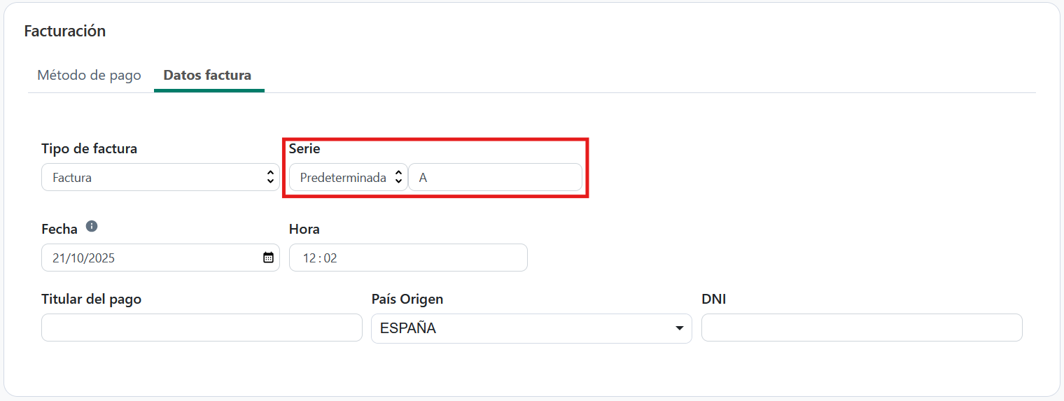 - Serie: si la empresa tiene activadas las series de facturación, les aparecerá esta opción donde pueden elegir la serie en la que quieren facturar: