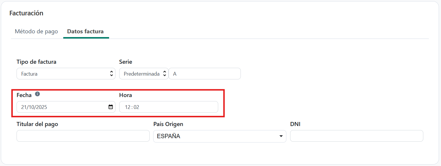 En este apartado indicaremos los métodos de pago utilizados en nuestro cobro y elegiremos entre las distintas opciones de facturación. Por lo tanto, este apartado se divide en dos parte: Método de pago y Datos factura.