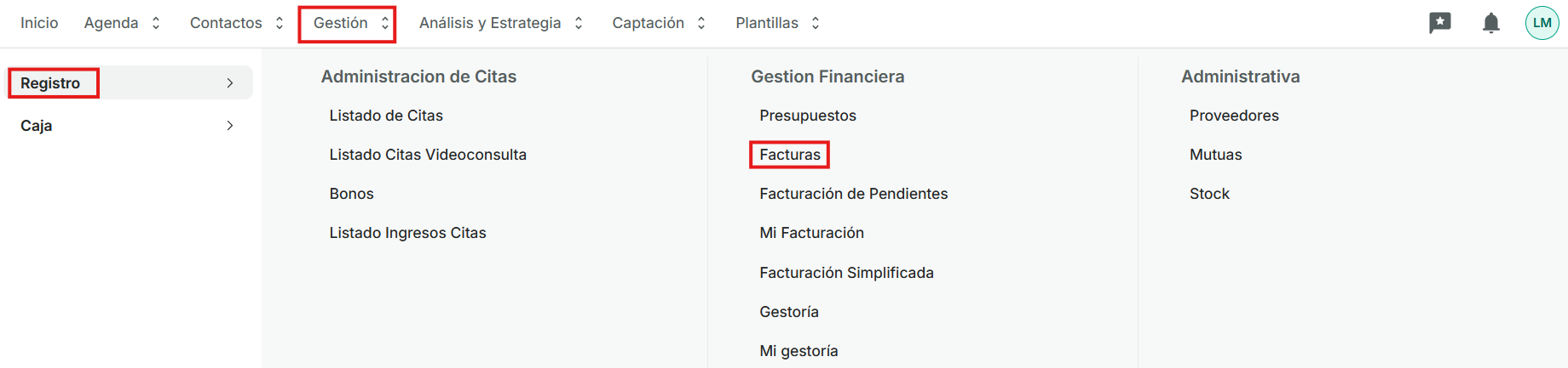 Desde el Gestión > Registro > Facturas, podremos visualizar todas nuestras facturas.