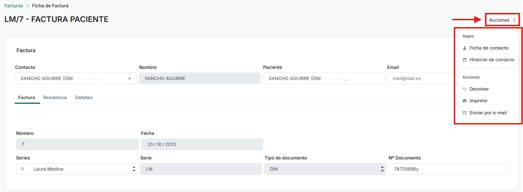 Cuando accedemos a una factura, en la parte superior derecha nos encontramos con el botón de Acciones, desde el cual podemos: