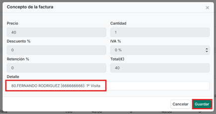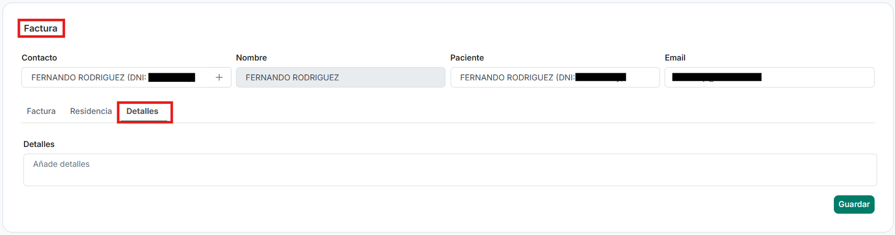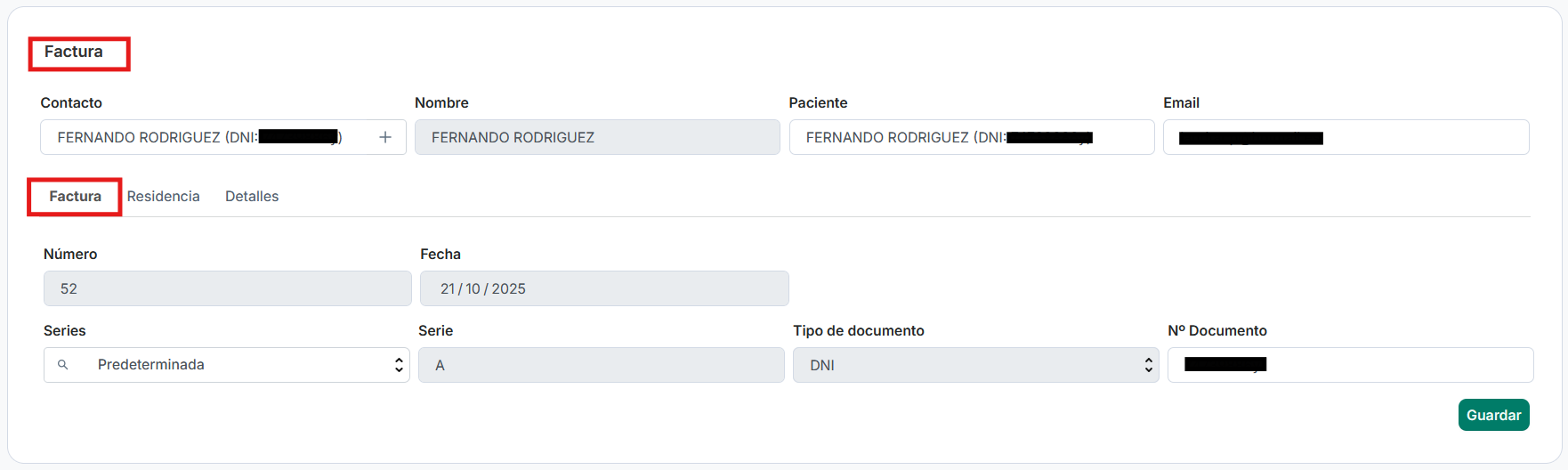- Factura: Aquí vemos el número de factura, la fecha, la serie (en caso de utilizar series de facturación) y el DNI del paciente. Estos datos no se pueden editar.