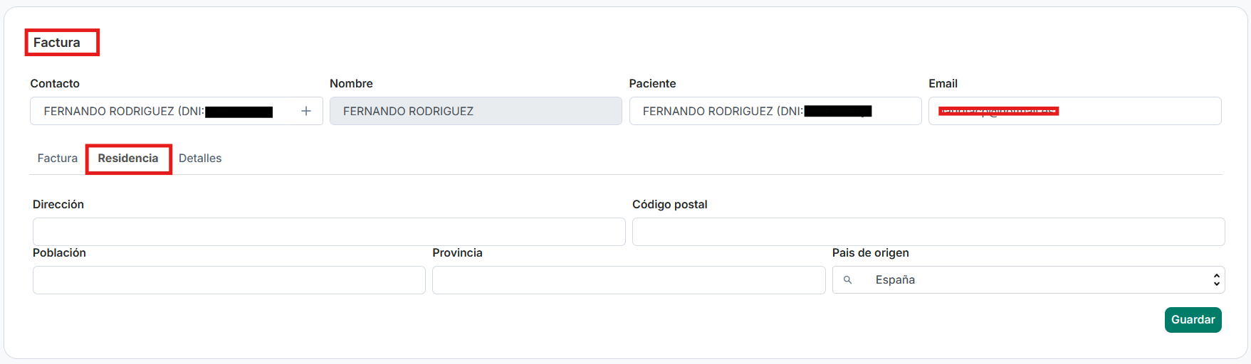 - Residencia: Dirección del paciente, estos datos sí se pueden editar.