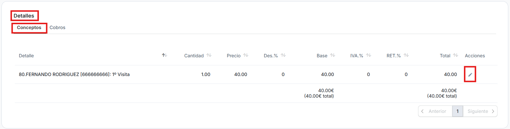 - Conceptos: Donde vemos todos los conceptos (servicios y/o productos) que se le han facturado al contacto. El detalle del concepto lo podemos editar clicando en el lápiz que encontramos en la parte derecha: