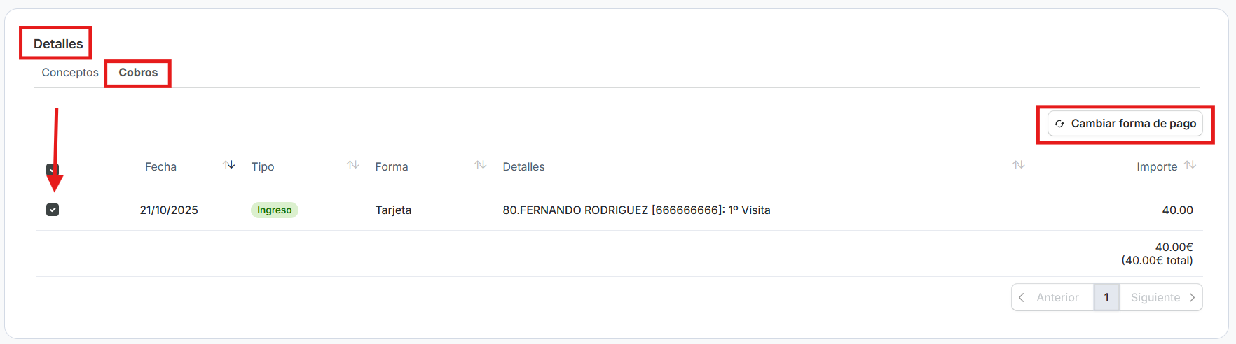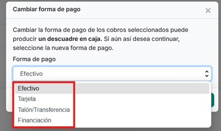 - Cobros: Donde vemos los cobros asociados a esta factura. En este apartado podemos cambiar la forma de pago de los cobros si por error nos hemos equivocado a la hora de facturar. Para ello solo tenemos que seleccionar los cobros que queramos y clicar en "Cambiar forma de pago":