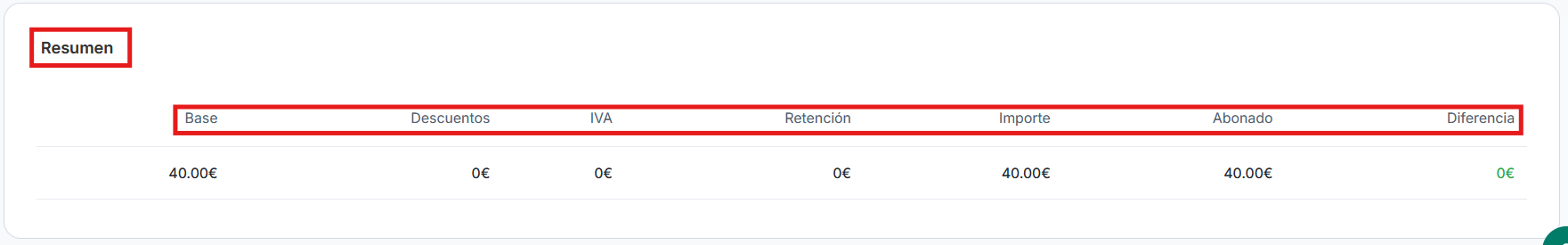 En esta parte vemos de manera resumida los detalles del importe facturado: Base, descuentos, IVA, retención, importe, abonado (importe abonado), diferencia (importe pendiente por abonar):