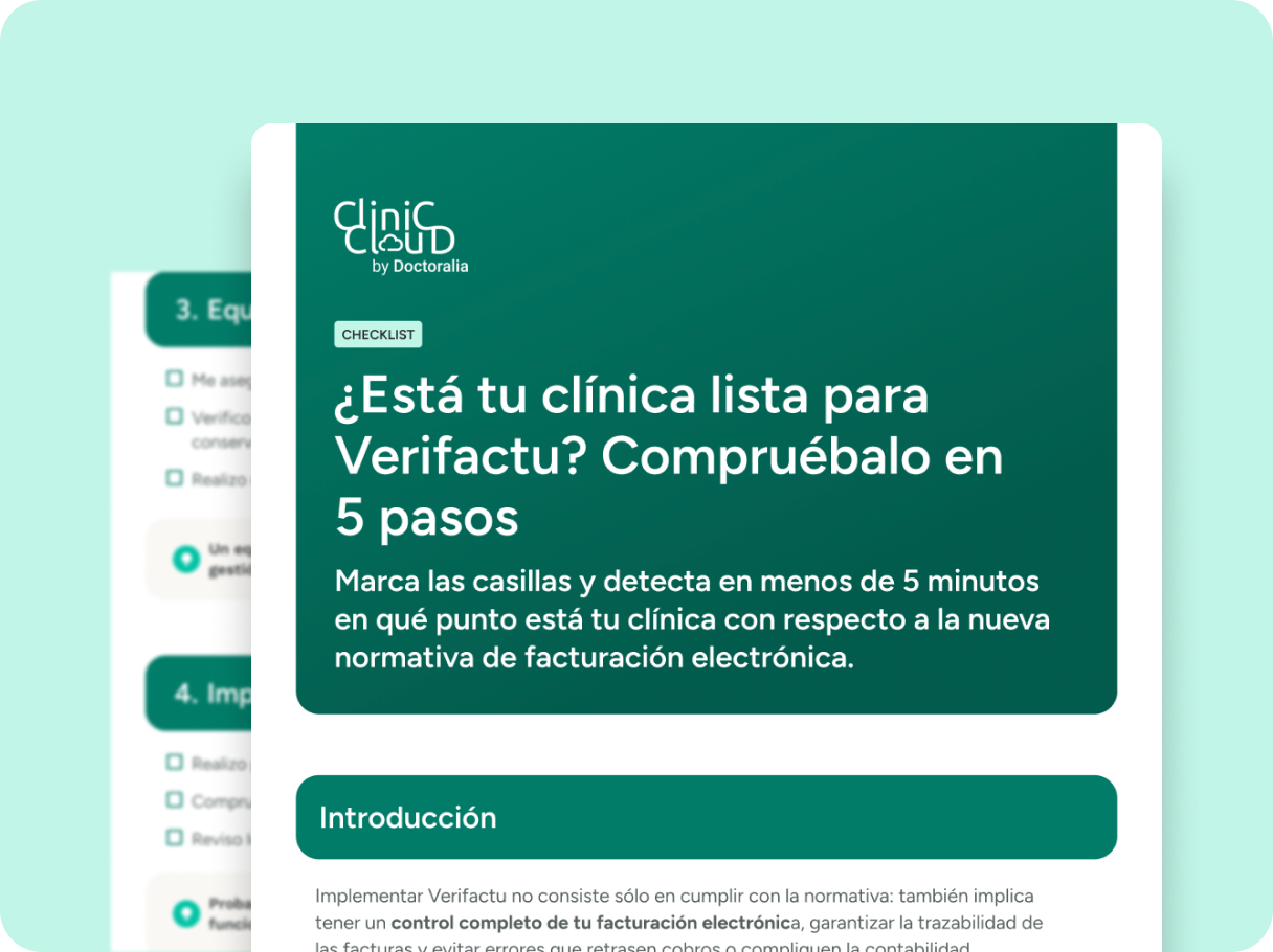Optimiza la gestión de tu clínica y asegura el cumplimiento de la facturación electrónica con esta checklist gratuita. Evalúa en pocos minutos si tu clínica está preparada para Verifactu y detecta posibles áreas de mejora antes del cierre fiscal.